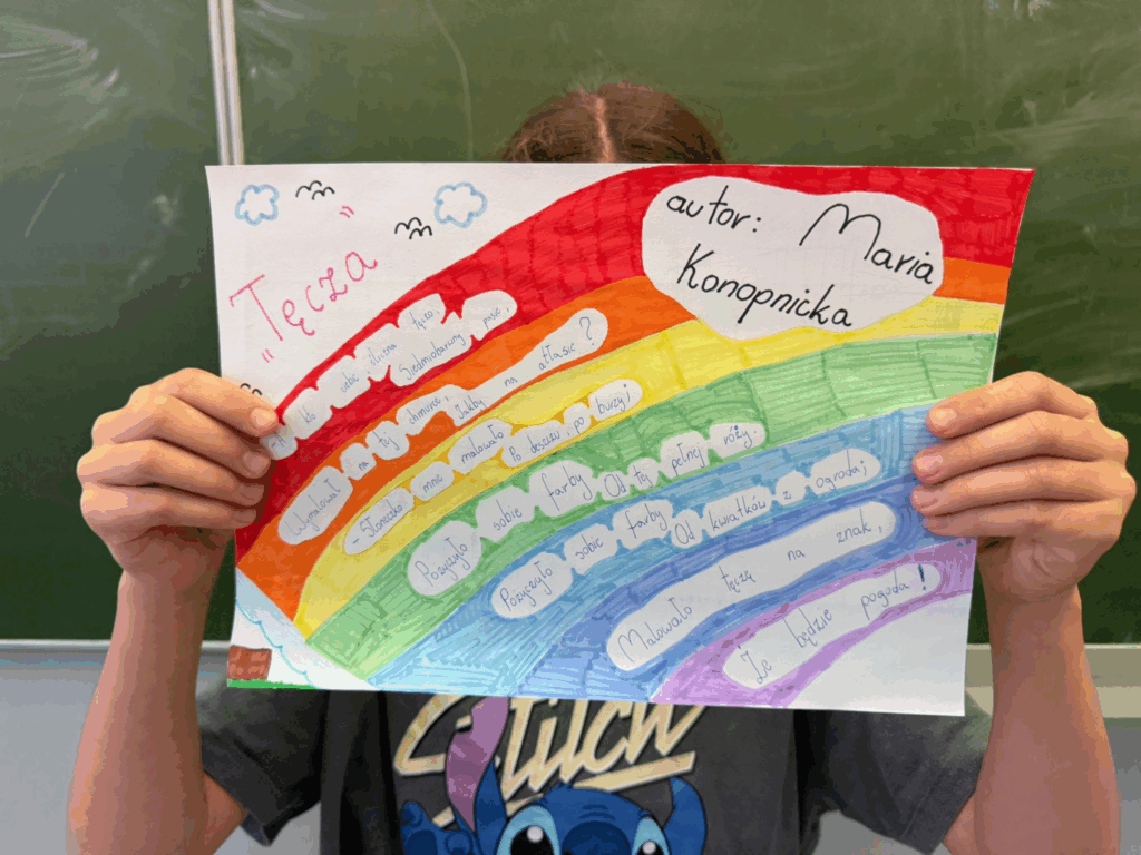 Uczniowie poradzili sobie z zadaniem rewelacyjnie. Po odszukaniu odpowiednich wierszy zapisali je, tworząc kaligramy. Porównywali swoje prace do wierszy dorosłych twórców: Kerna, Brzechwy i innych. Wystawa prac uczniów w sali nr 4.
