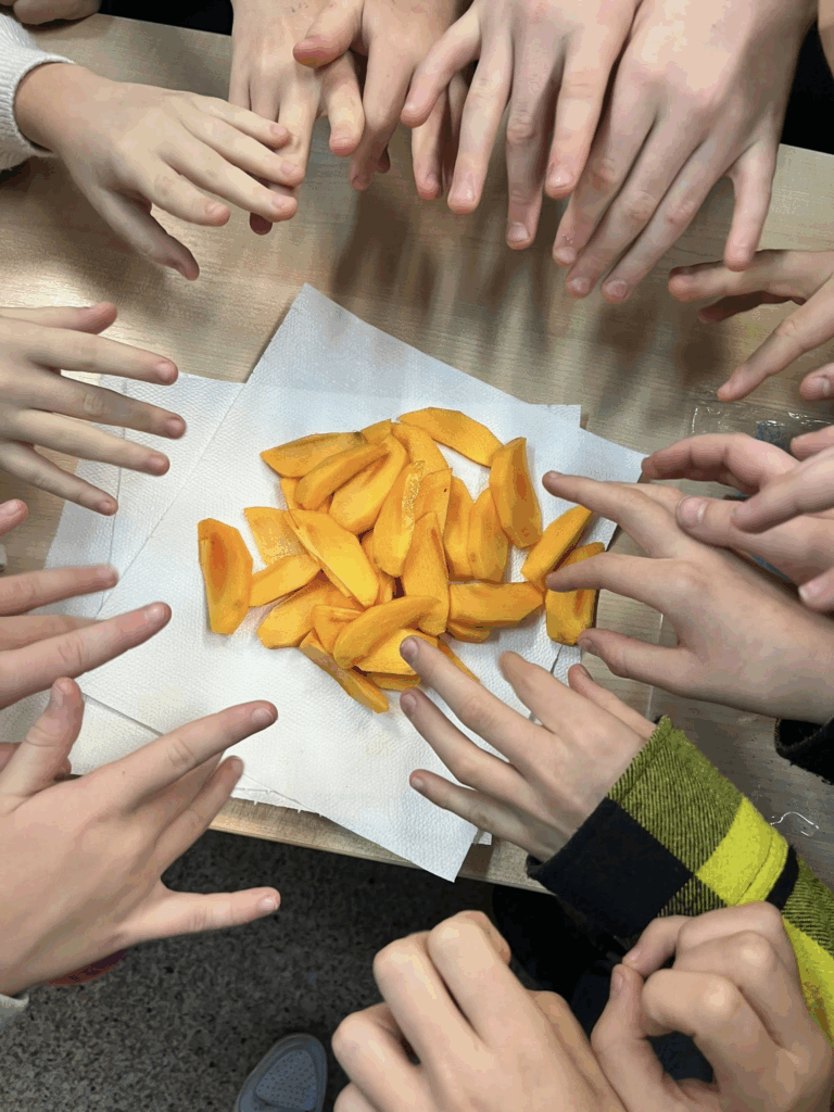 Dziś poznawaliśmy owoce tropikalne – ich wartości odżywcze oraz bogactwo witamin. Mieliśmy także okazję spróbować owocu kaki, które jest źródłem witaminy A, C oraz błonnika, wspierając odporność i pracę układu pokarmowego.